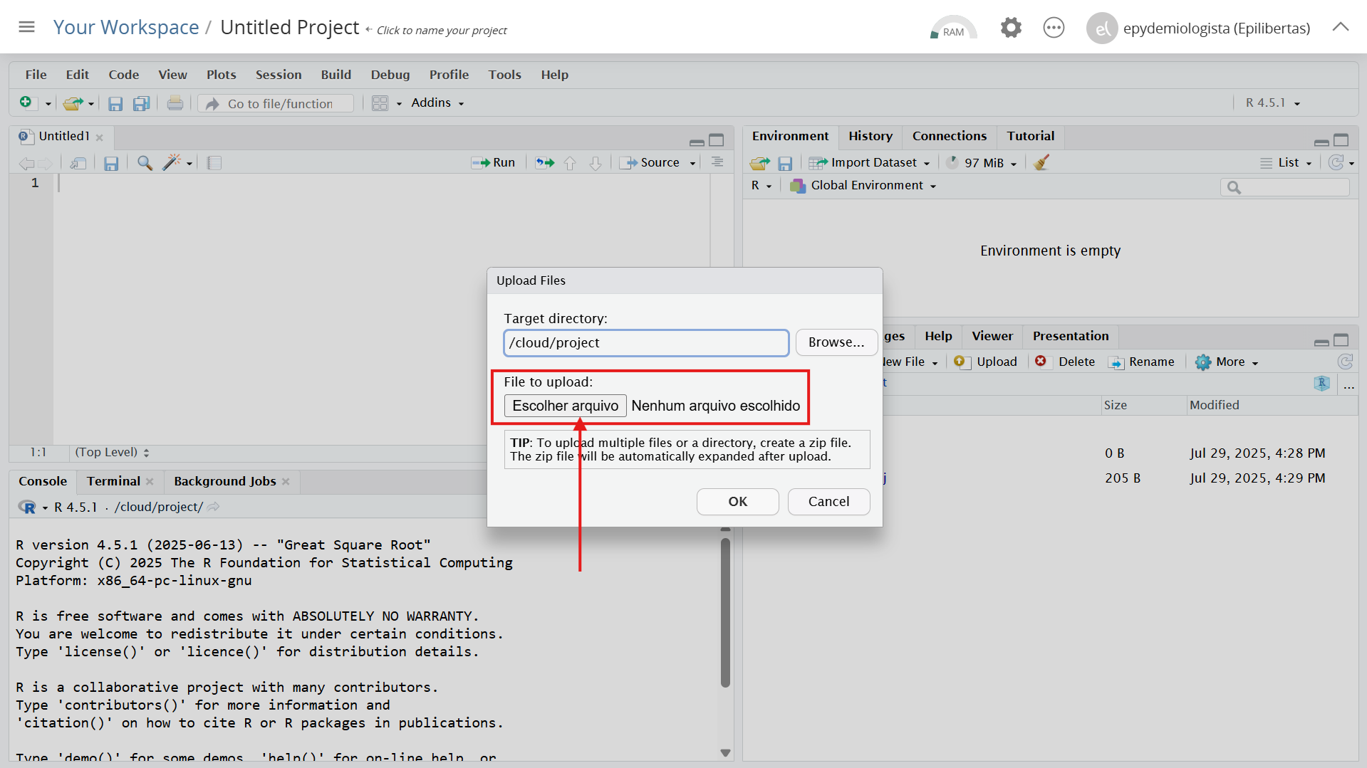 No canto inferior direito (Quadrante 4), clique em Upload para enviar o arquivo de dados para o RStudio Online.