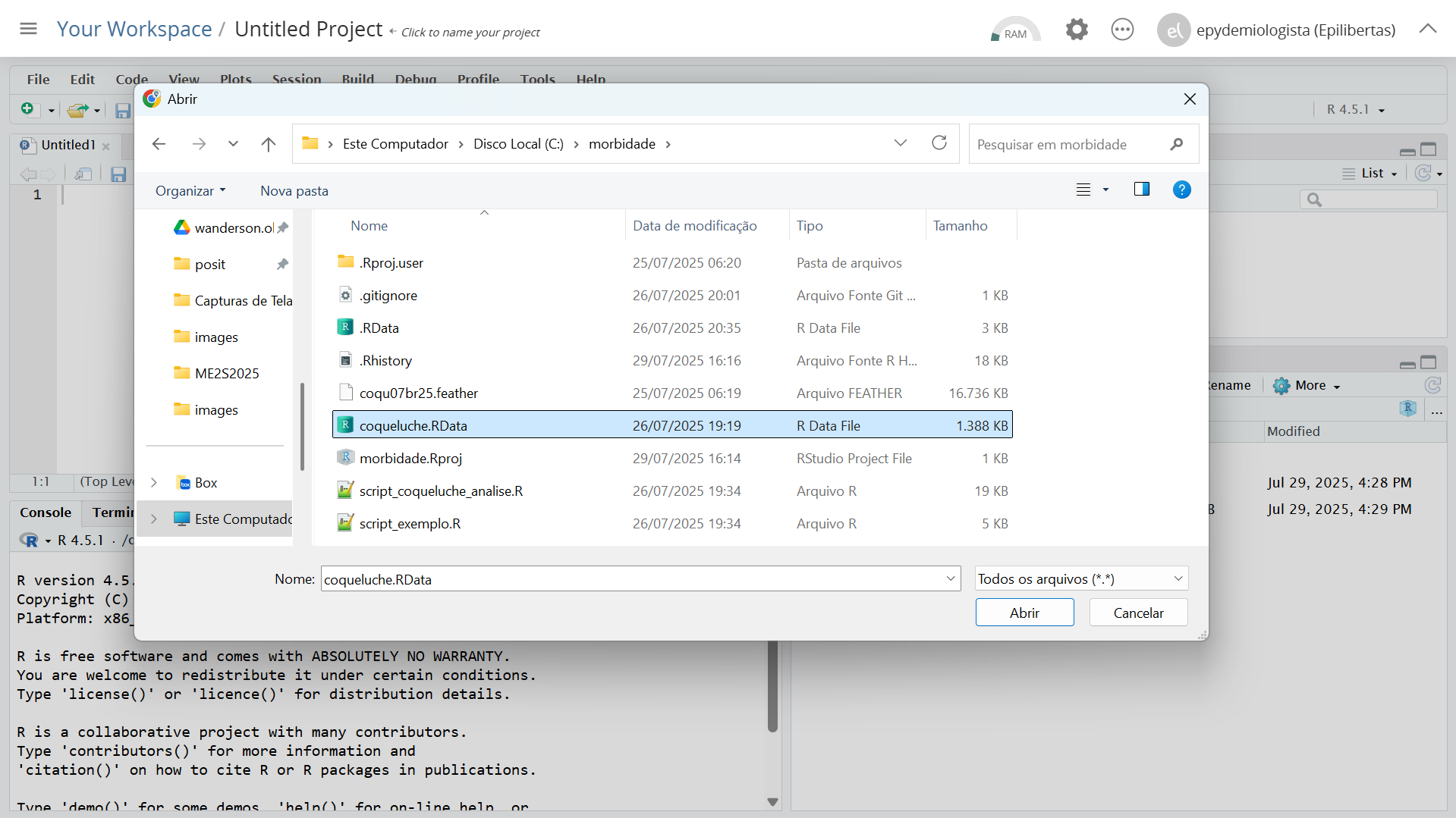 Agora clique em Escolher arquivo, localize o arquivo coqueluche.RData (que está na pasta Morbidade), e depois clique em OK.