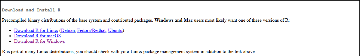 ➔ Clique em “Download R for Windows, ou Mac ou Linux”, depois em “base”, e finalmente em “Download R-X.X.X for Windows” (a versão mais recente).