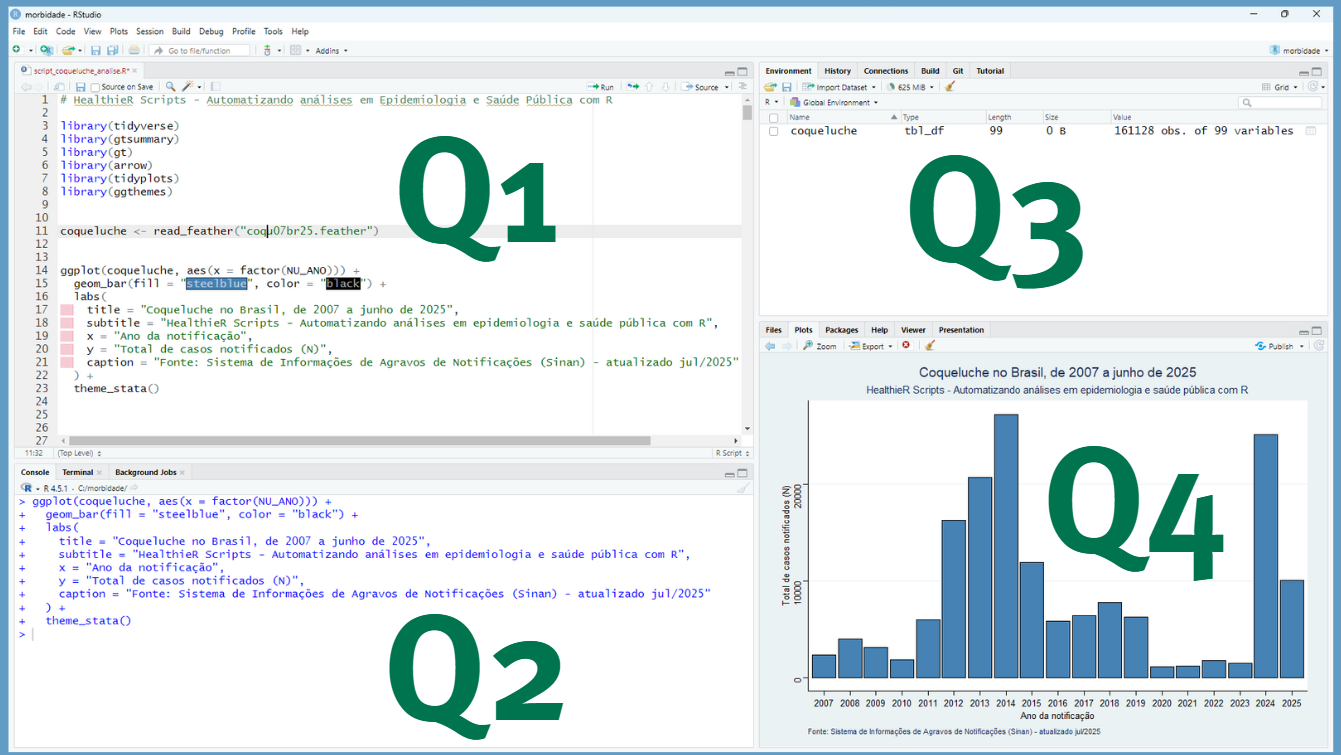 | Q1 | Editor: scripts, tabelas, visualizações | Onde você escreve e edita seu código em R |